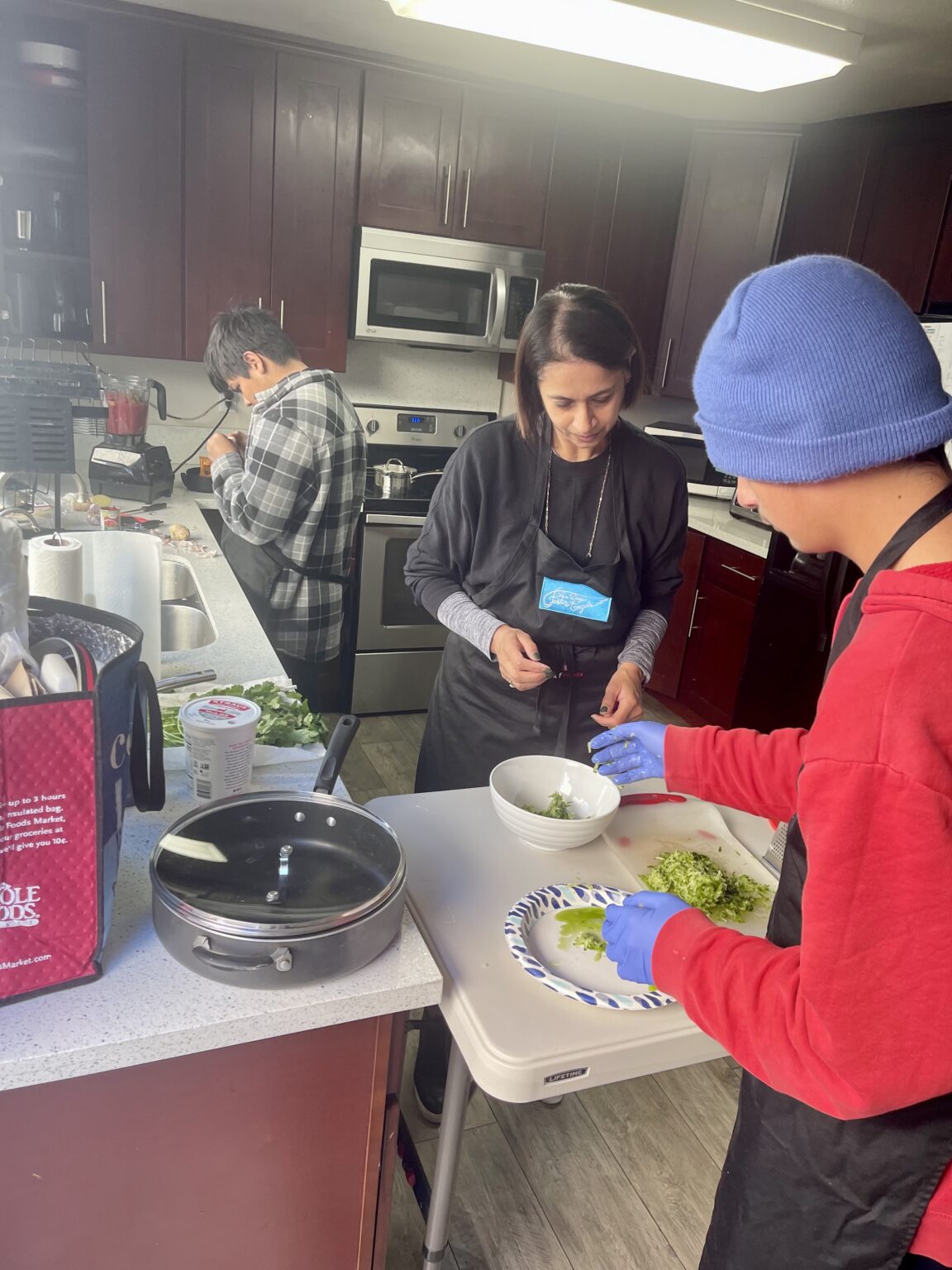 It didn’t take long for the whole house to start smelling delicious. We prepped a cooling raita, then started making a base tomato curry sauce. Sushma then showed the boys how to adjust the base sauce with spices and other aromatics to make it into a garbanzo bean curry and a chicken curry. Fragrant rice was cooking off to the side while the other pots were simmering. Naan bread in the oven finished the meal off nicely.