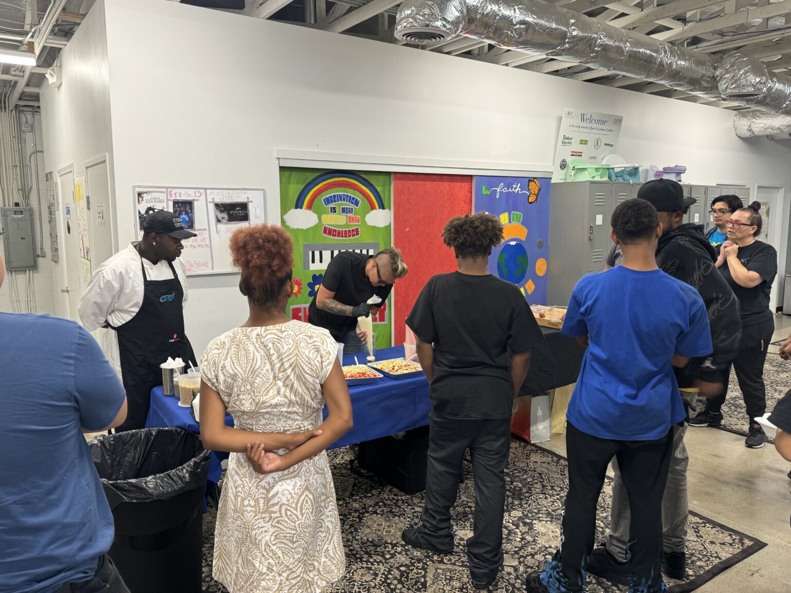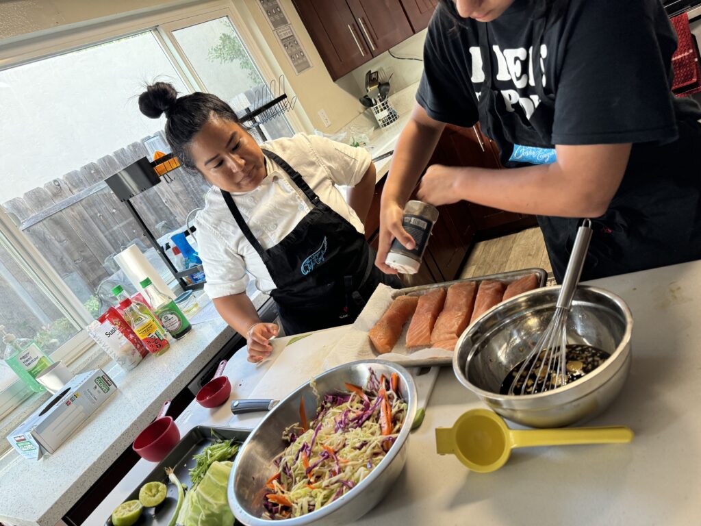 There was a delicious pasta bar. Out of the kindness of her heart, Chef Jillian brought the youth that night’s dinner service, served by our lovely volunteers Kassandra and Jessie. There was 2 kinds of pasta, garlic bread, salad, and 2 kinds of dressing. Yum! And then we had our Chef Angels class, learning all about trifle, and how to build and layer your own, with lots of fresh chopped fruit, of course.