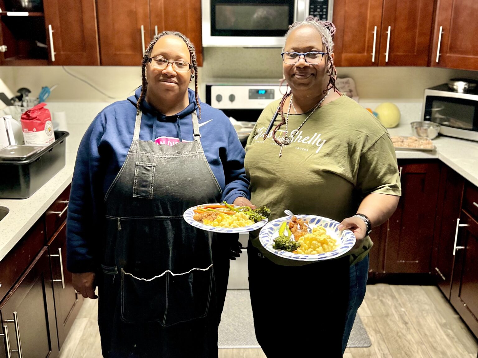 Chef Shelly’s menu included the boys favorite hot honey chicken bites, mac ‘n cheese casserole, and some requisite vegetables. The chicken got a marinating bath before being dredged in coating and fried. The mac ‘n cheese was quickly assembled and put in the oven. Veggies got a toss in the pan, the pan flipping technique was demonstrated and practiced. Everyone was super stoked for a yummy dinner!