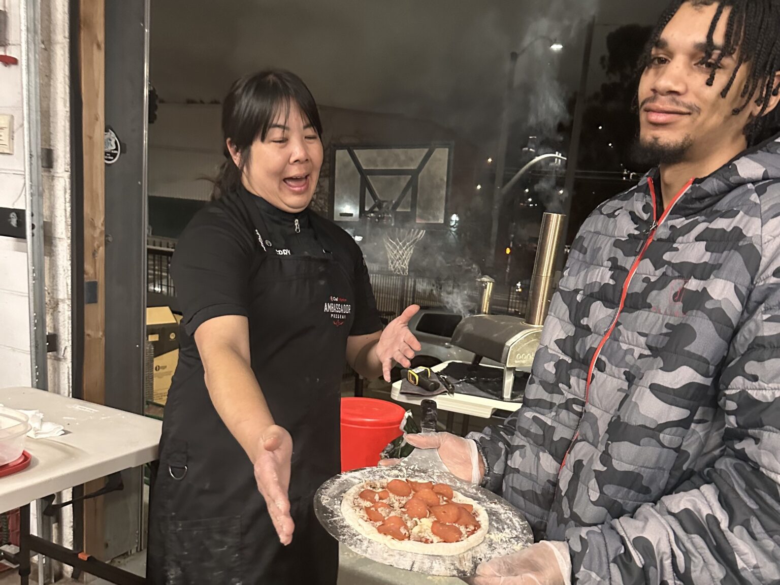 What can we say about this amazing workshop with Chef Christina! She quickly gathered a rapt audience, and got busy prepping all the toppings, then mixing and kneading the dough with some eager volunteers. One by one, the youth all got to take their turn at the prep table and then the hot pizza ovens to create their masterpieces. Some showed off their Pizza Hut skills, flipping the dough in the air, others were a bit more timid and unsure, but equally as excited to taste the results. Us Chef Angels volunteers checked and tasted as many as we could, and gave a thumbs up all round!