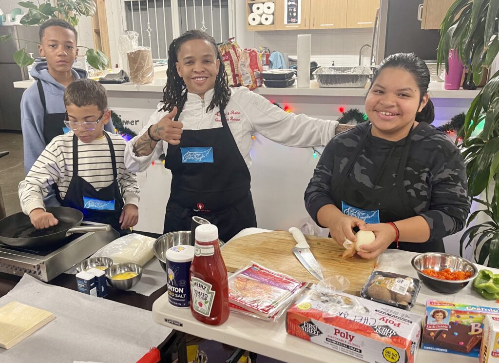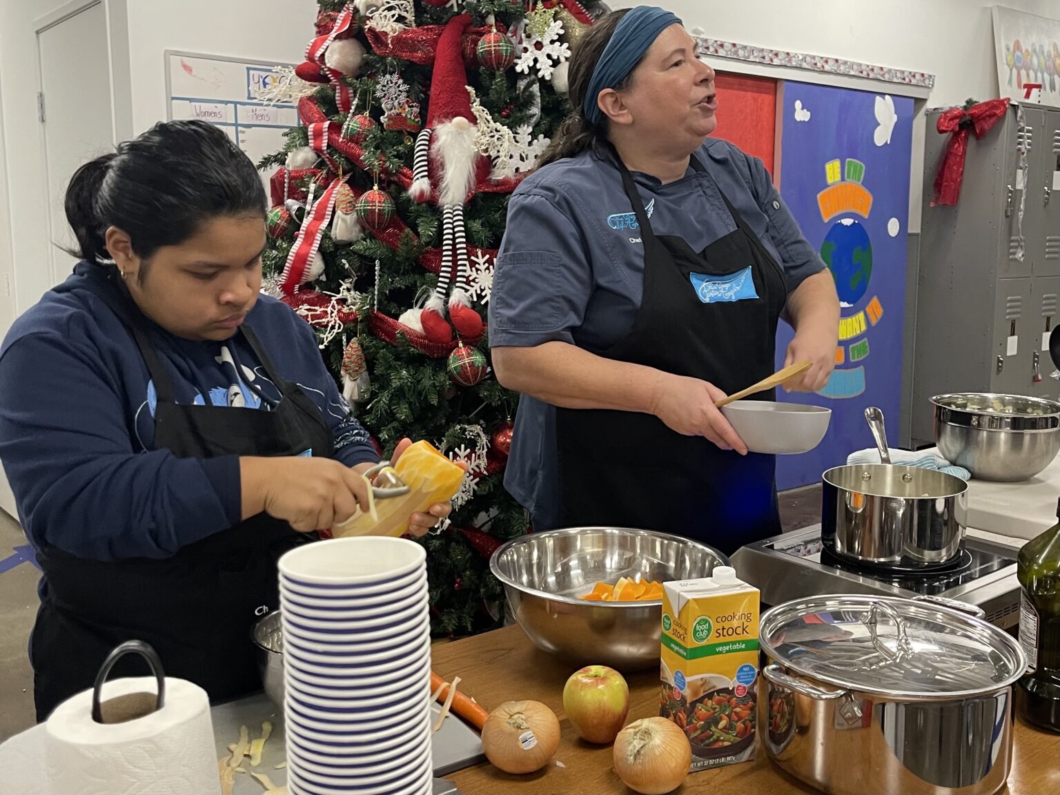 Our founder Chef Lena brought her soup game to class tonight to coincide with the arrival of winter storm season. The prep table was piled high with veggies of all colors. Onions were chopped, potato peeled, garlic minced up, zucchini trimmed, butternut peeled and cored… Before too long a bright green spinach and zucchini soup was blended and ready to serve. Followed shortly by butternut squash soup. Happy bellies for all!
